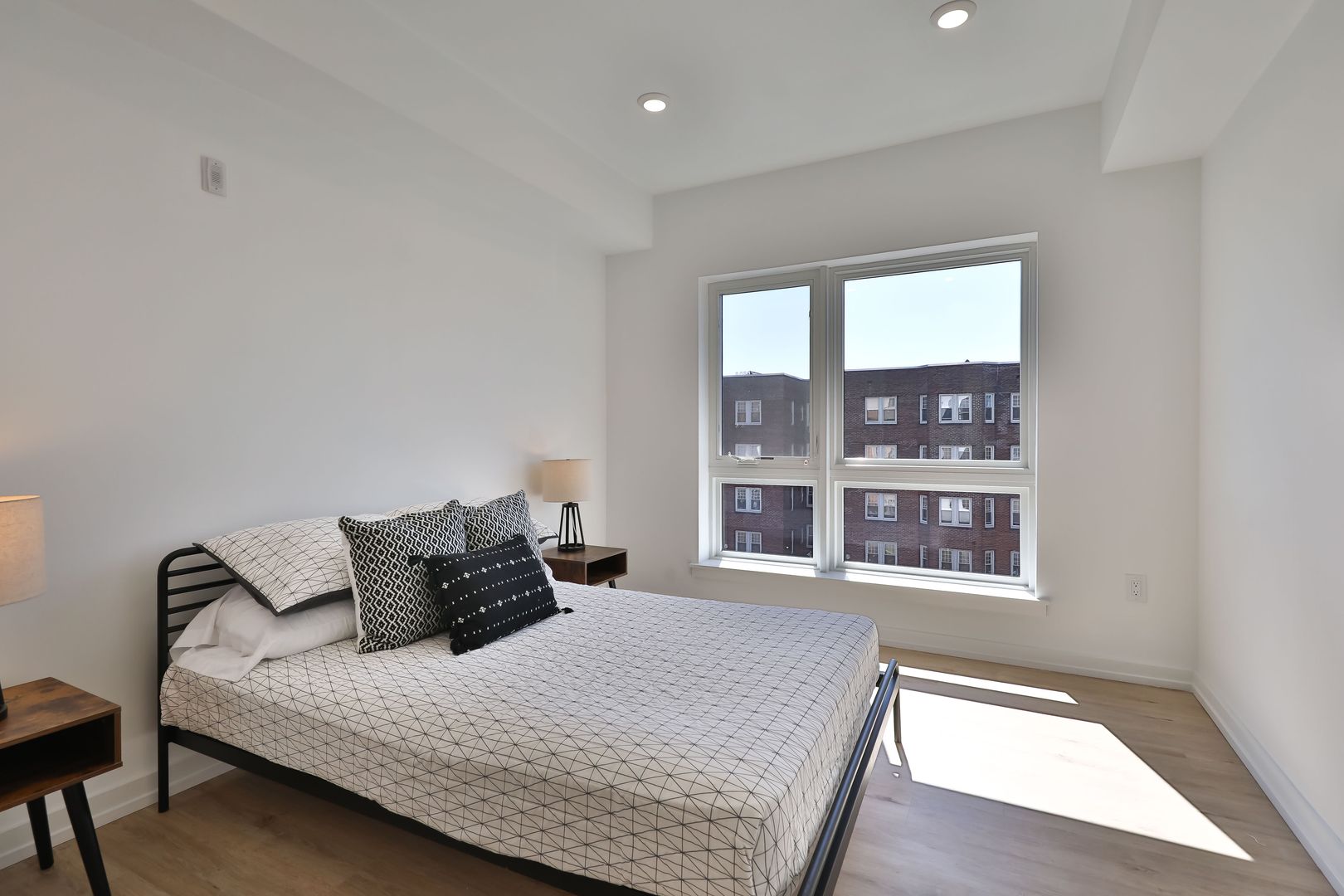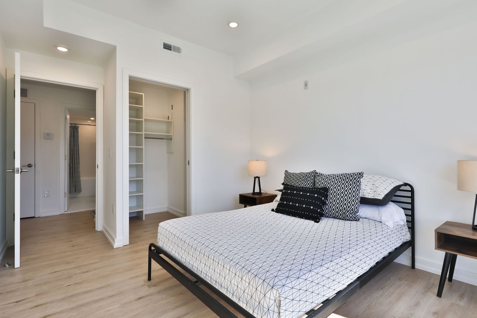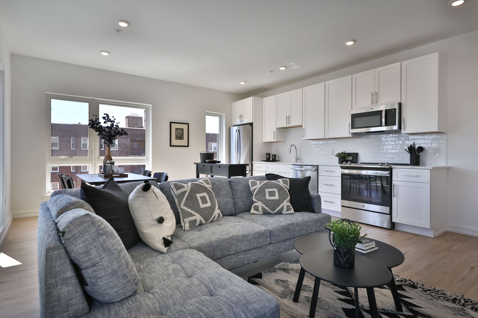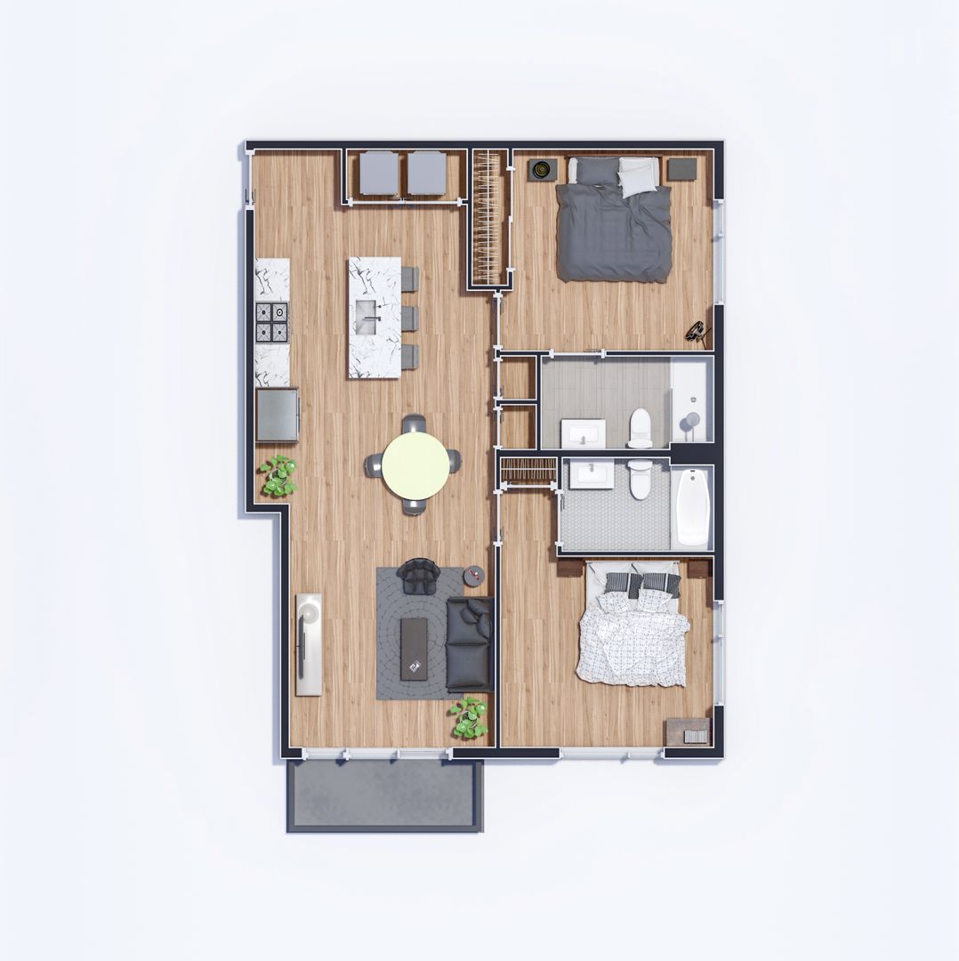 This two bedroom unit offers soaring ceilings, massive windows, and tremendous natural light. Stainless steel appliances (including dishwasher!) and custom quartz counters adorn every kitchen. Every apartment has loads of storage and custom closets.