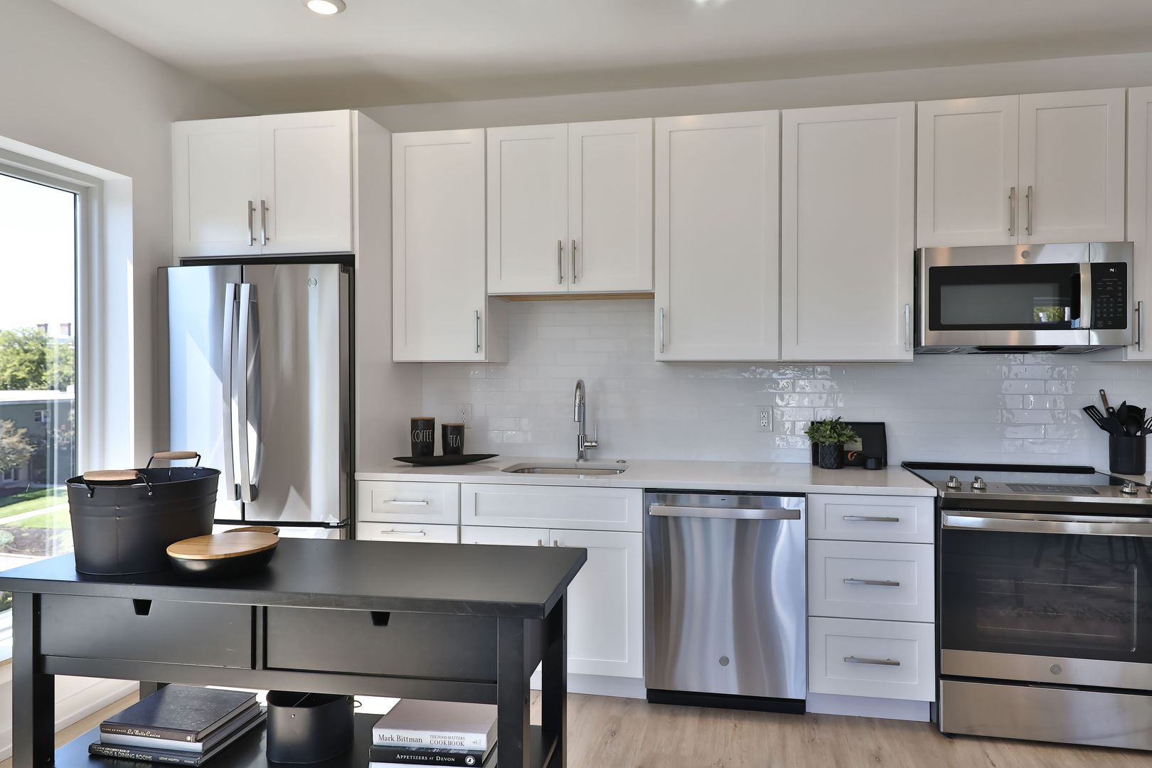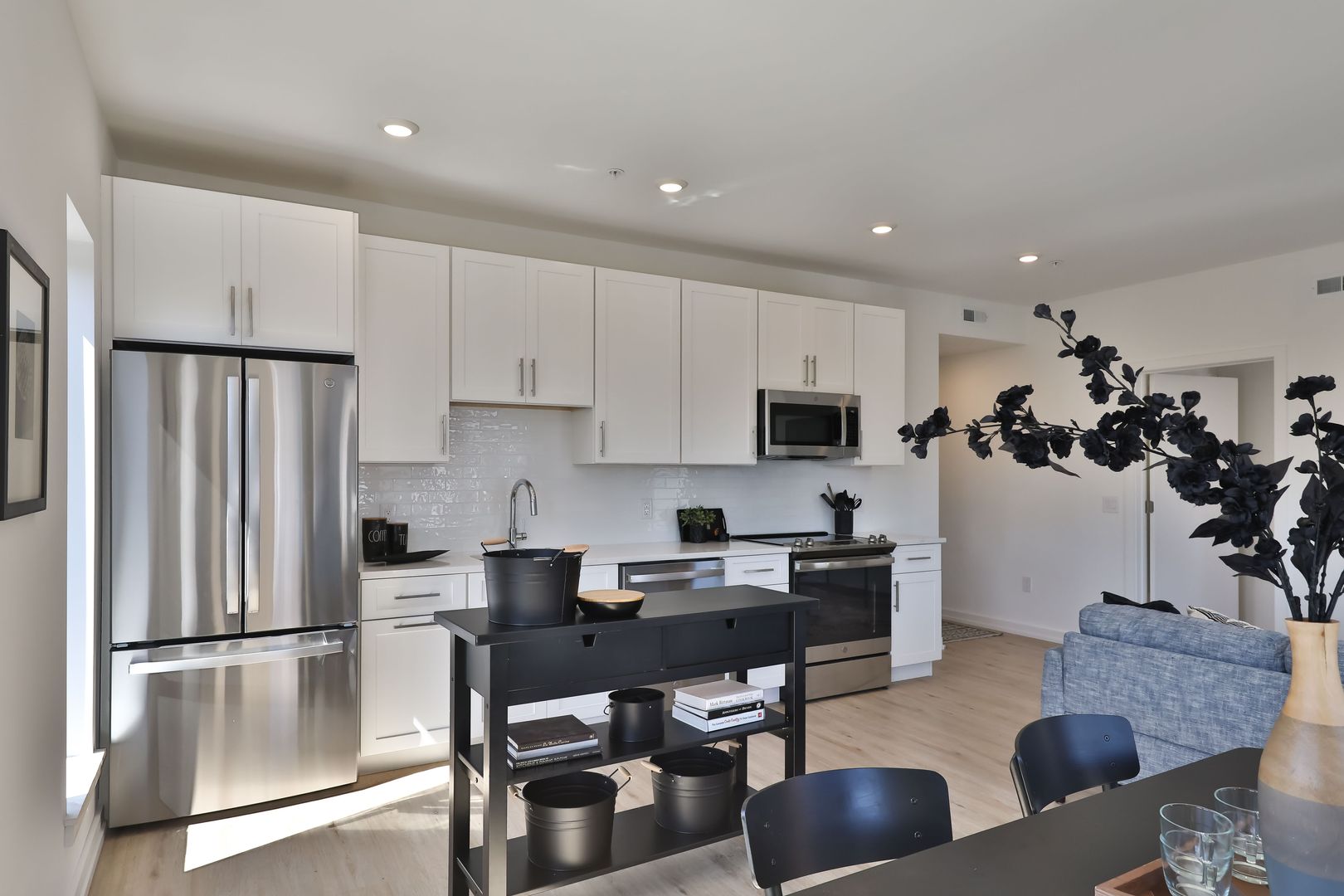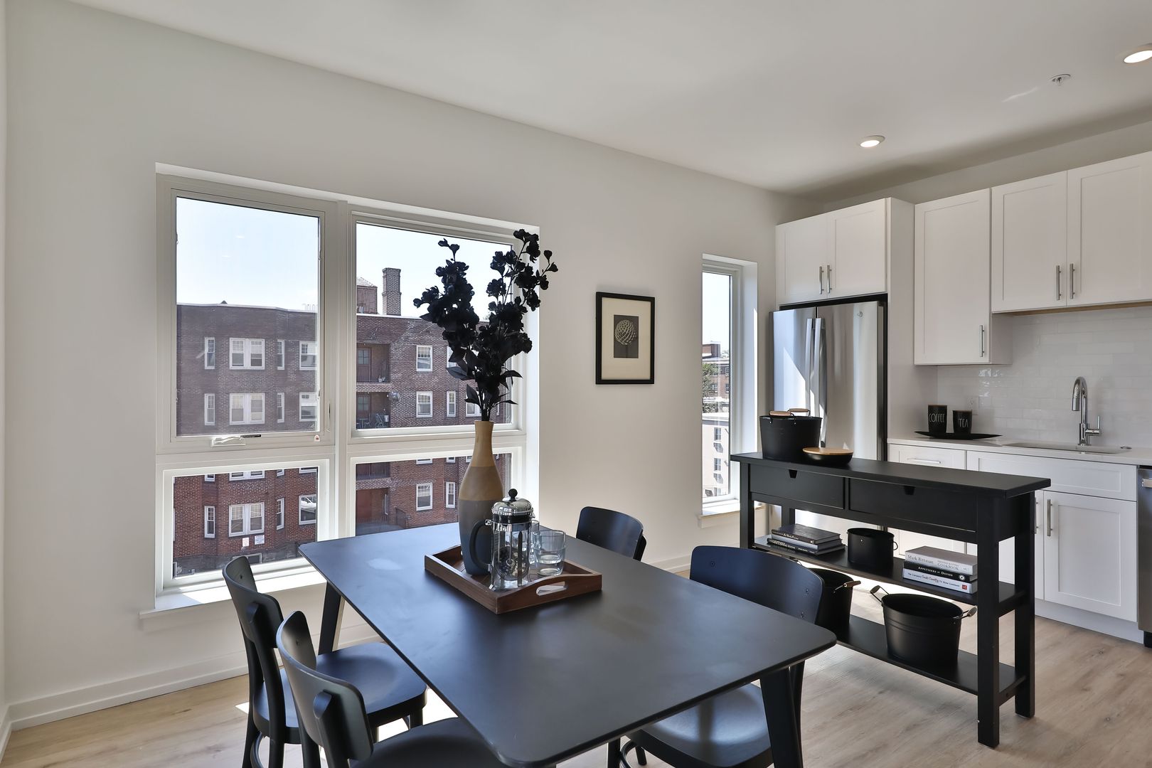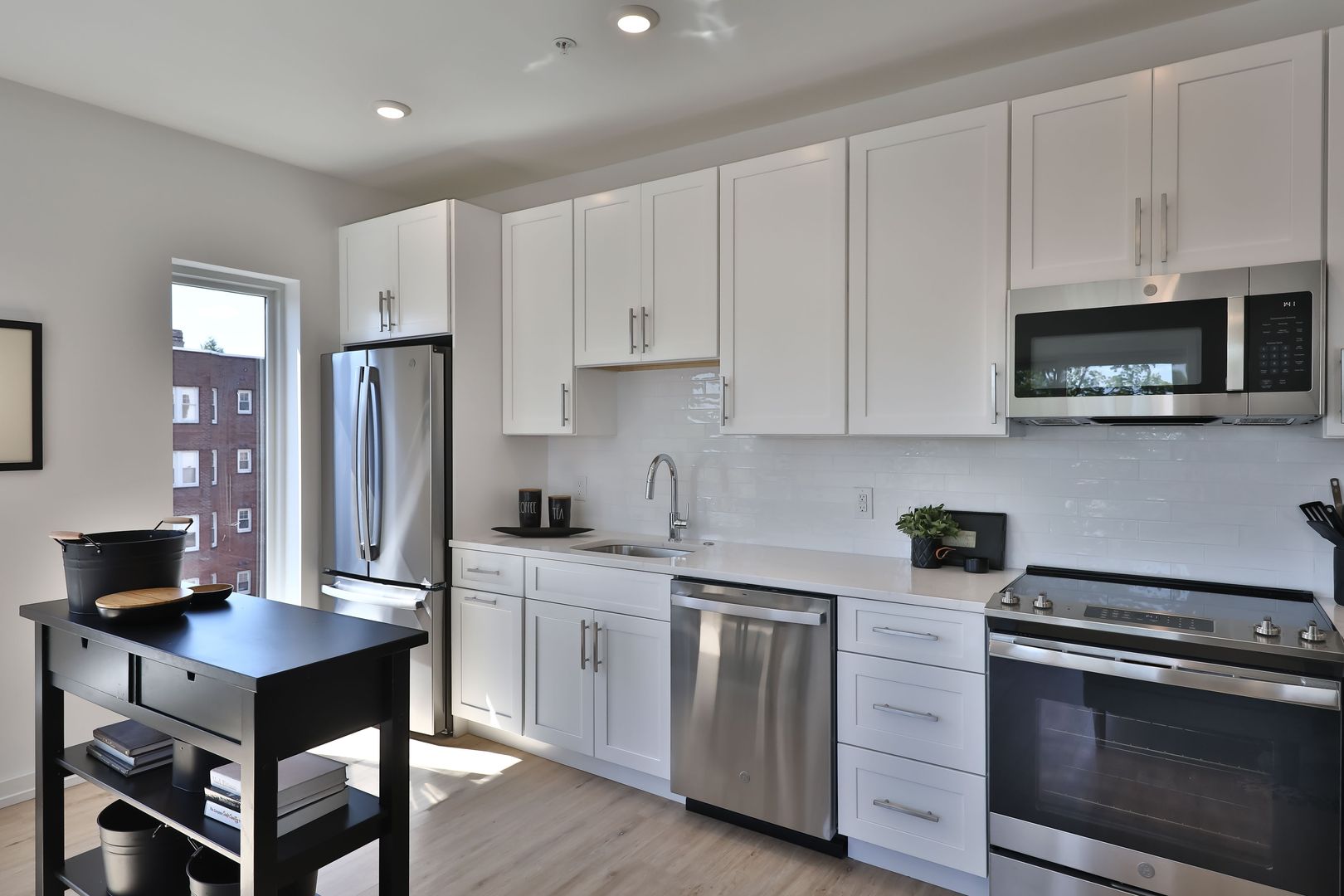 This two bedroom unit offers soaring ceilings, massive windows, and tremendous natural light. Stainless steel appliances (including dishwasher!) and custom quartz counters adorn every kitchen. Every apartment has loads of storage and custom closets.