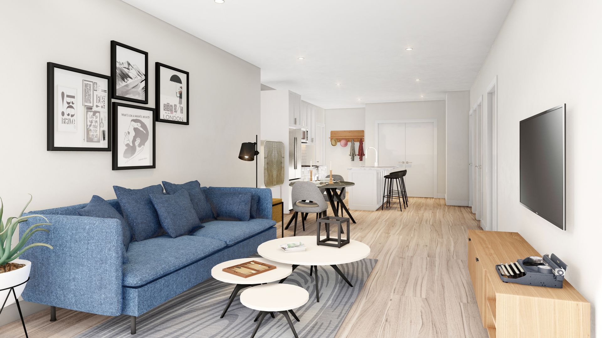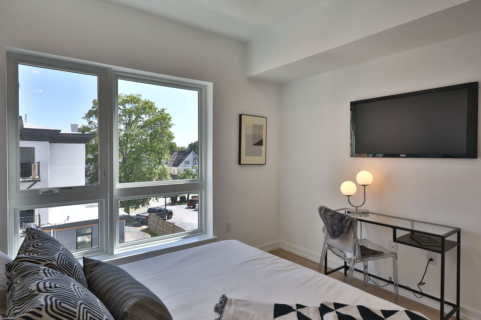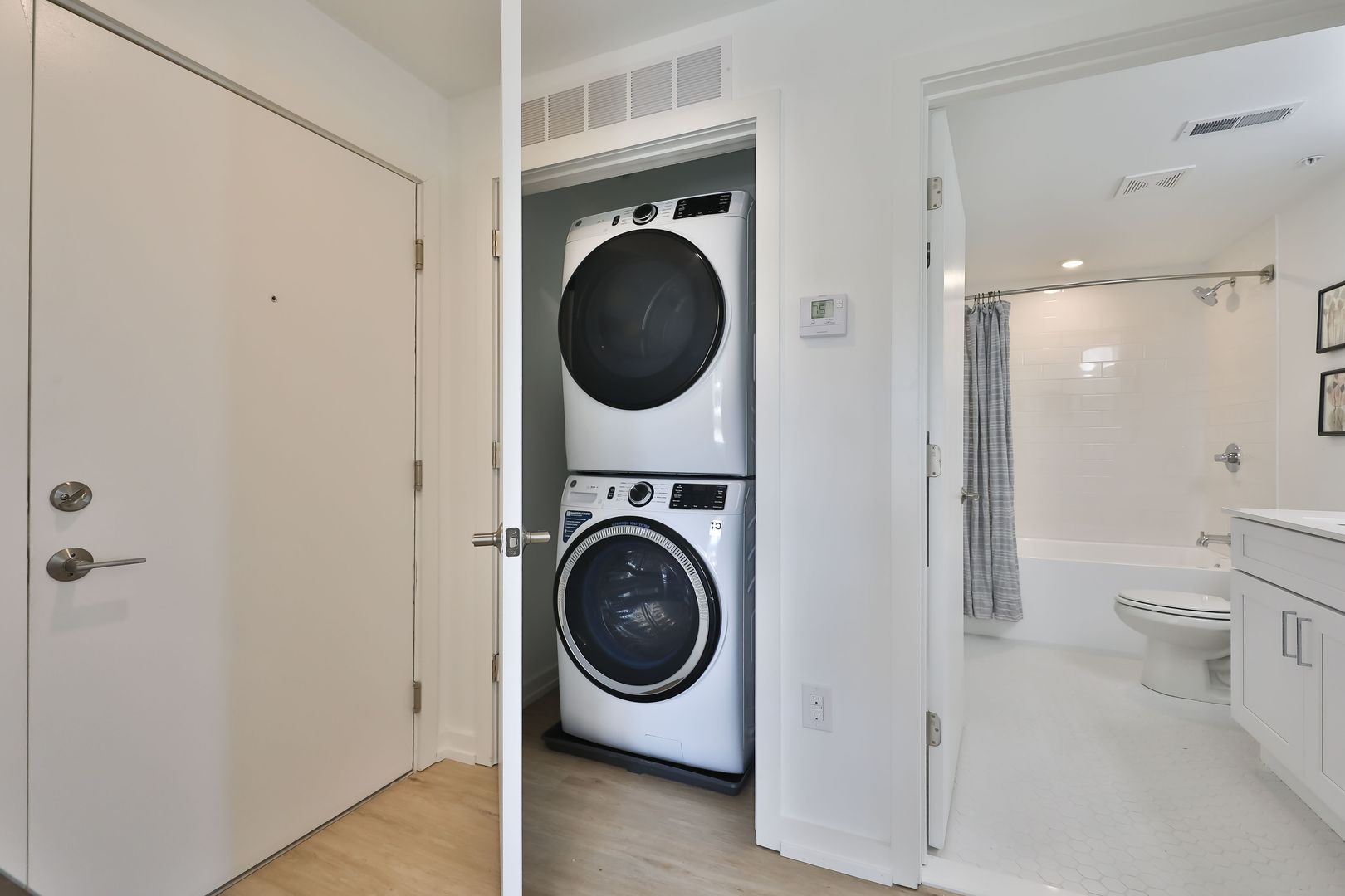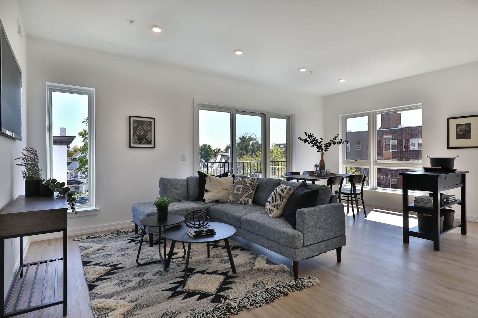This two bedroom unit offers soaring ceilings, massive windows, and tremendous natural light. Stainless steel appliances (including dishwasher!) and custom quartz counters adorn every kitchen. Every apartment has loads of storage and custom closets.