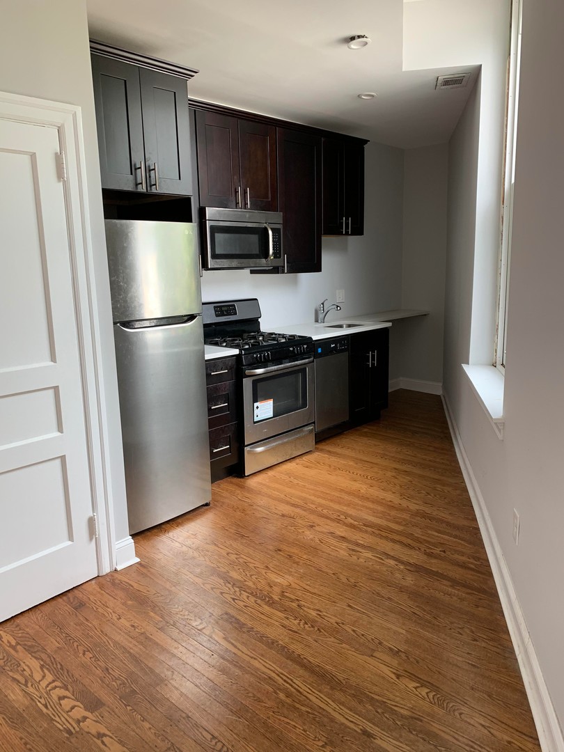 Apartment is part of a nine unit complex. It has hardwood floors and stainless steel appliances (fridge, dishwasher, microwave, gas range, and a garbage disposal). Large windows in the kitchen/living room allow for plenty of natural light to come through. Bedroom can comfortably fit a queen size bed and has a small closet. Bathroom has vintage tile. Central air and heat.